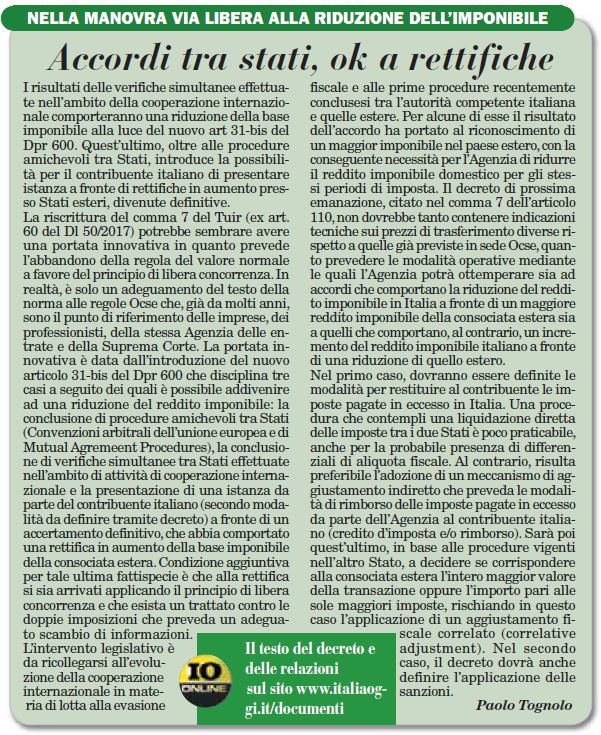 The results of simultaneous tax inspections to be carried out in several countries might imply the reduction of the Italian taxable income based on what provided by article 31-bis of DPR 600. This latter article provides, in addition to MAP cases, the possibility for the Italian taxpayer to submit an adjustment request to the Italian tax authorities in case foreign tax assessments become definitive have increased the foreign taxable income.