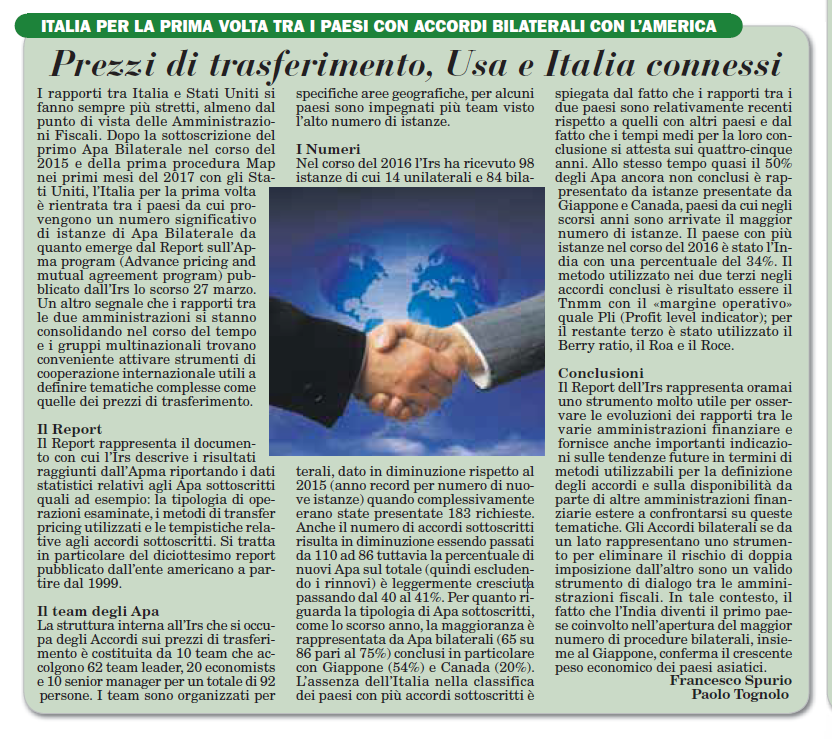 I rapporti tra Italia e Stati Uniti si fanno sempre più stretti, almeno dal punto di vista delle Amministrazioni Fiscali. Dopo la sottoscrizione del primo APA bilaterale nel corso del 2015 e della prima procedura MAP nei primi mesi del 2017 con gli Stati Uniti, l’Italia per la prima volta è rientrata tra i paesi da cui provengono un numero significativo di istanze di APA bilaterale da quanto emerge dal report sull’APMA program (Advanced Pricing and Mutual Agreement Program) pubblicato dall’Irs lo scorso 27 Marzo.